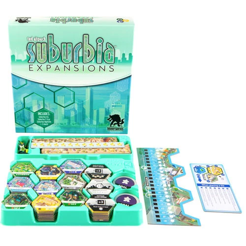 Expansions contains three giant expansions for Suburbia 2E: Suburbia Inc., Suburbia 5-Star, and Suburbia Nightlife, as well as two smaller expansions: Essen and Cons. These expansions may be added to the base game one at a time, in portions, or all at once, to make for a fully customizable city-building experience.