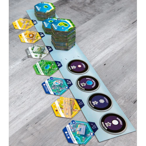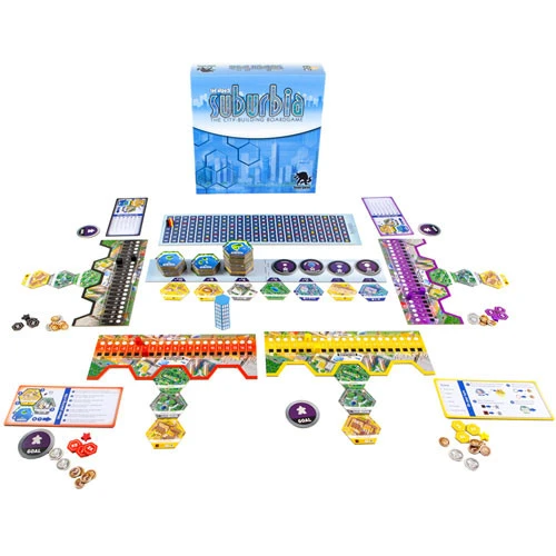 Suburbia is a tile-laying game in which each player tries to build an economic engine and infrastructure that will be self-sufficient, and eventually become both profitable and encourage population growth. As your income increases, you’ll have more cash to purchase better buildings, such as an international airport or a high rise office building. As your reputation increases, the population will grow as well. The player with the largest population wins!