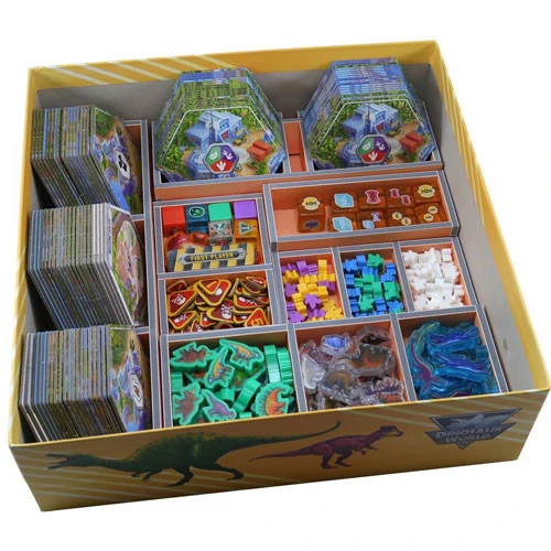 Official full-colour insert compatible with Dinosaur World, including space for the Hybrid Pack, Ice Age Pack and Water Pack expansions. The design provides both efficient storage and improved game play, with removable token trays for use during the game. The rule books act as a lid on top of the trays.
