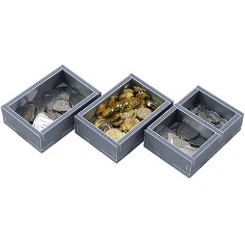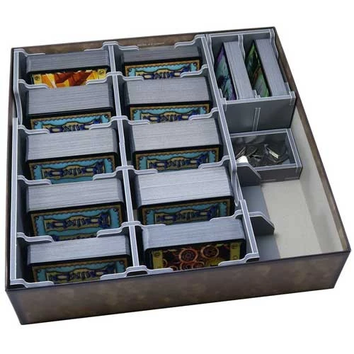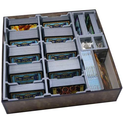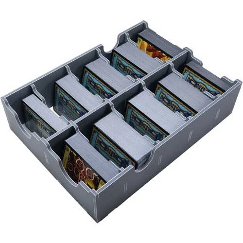 Official insert compatible with Dominion, with space for 1,100 sleeved or 1,850 unsleeved cards. The design provides both efficient storage and improved game play, with removable token trays for use during the game. The rule books act as a lid on top of the trays.