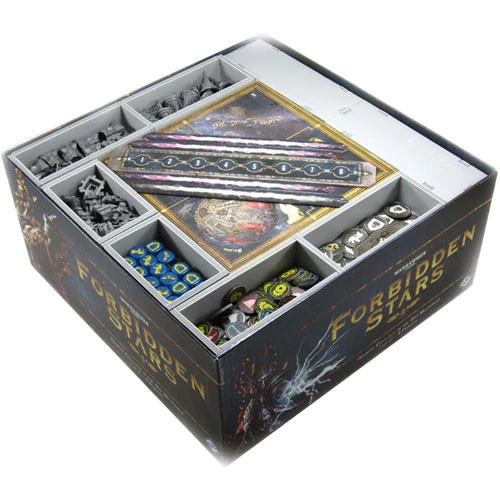 This insert is designed to be compatible with Forbidden Stars. The design provides both efficient storage and improved game play. Many of the trays can be utilised during the game, and they greatly aid set-up and clear-away times. The game rules act as a lid on top of the trays. The trays have space for all cards to be sleeved.