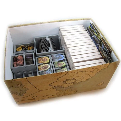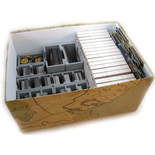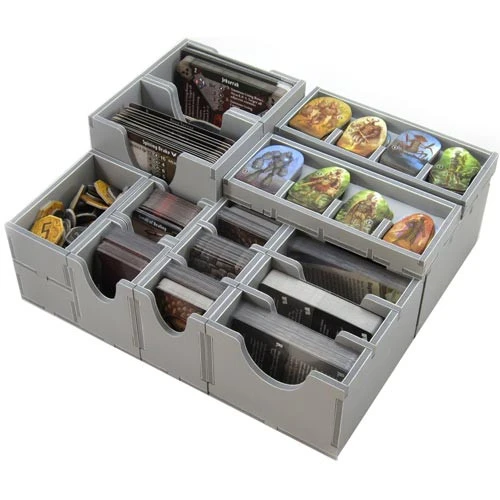 This insert is designed to be compatible with Gloomhaven . The design provides both efficient storage and improved game play. Many of the trays can be utilised during the game, and they greatly aid set-up and clear-away times. There is space for all cards to be sleeved.