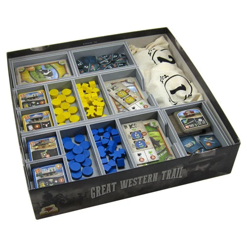 Insert compatible with Great Western Trail, and includes space for the Rails to the North Expansion. The design provides both efficient storage and improved game play. Many of the trays can be utilised during the game, and they greatly aid set-up and clear-away times. The rules act as a lid on top of the trays. There is space for all cards to be sleeved.