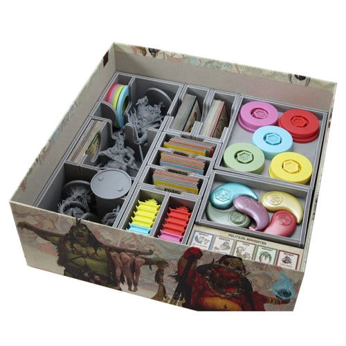 Insert compatible with Rising Sun, both the retail and the Kickstarter editions. The design provides both efficient storage and improved game play. Many of the trays can be utilised during the game, and they greatly aid set-up and clear-away times. The rules and boards act as a lid on top of the trays. The insert is designed to store all the Kickstarter version add-ons.