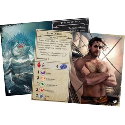 Under Dark Waves brings your investigation to Innsmouth and Kingsport with new neighborhoods, scenarios, investigators, monsters, and equipment for Arkham Horror. Stave off encroaching terror, trespass in Devil Reef or the Strange High House, and test your fortune against the tyrants of the deep!