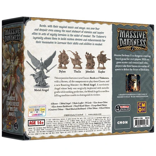 This expansion features 2 new Classes: Bards and Tinkerers, with 4 Heroes, all the components to play these Classes, and a new Roaming Monster: the Metal Angel. A narcissistic Angel whose body was surgically implanted with metallic grafts while seeking perfection, the Metal Angel is a soulless killing machine unable to distinguish its victims.