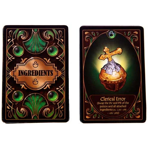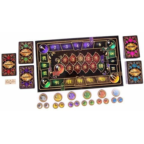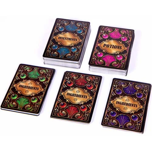 In Potions & Profits, you are a Wizard representing one of many pharmaceutical corporations looking for new Potions to invest in. Competing Wizards will try to outbid you for Potions as you balance both your Stock Value and your Public Relations.