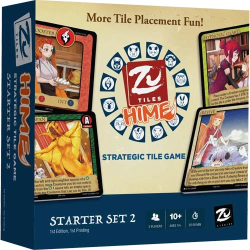 ZU Tiles: Hime is a strategic tile placement game based loosely on the creatures of the Chinese Zodiac. Players choose a creature (or creatures) to build customized decks around in order to out think and out play their opponent(s). Players earn points by creating patterns of “compatible squares” using creatures or by battling and capturing opposing creatures. The first player to 12 points wins! Think Collectable Card Game meets Dominoes, but with amazing anime inspired art and super fun tile interactions.